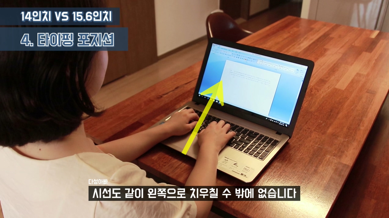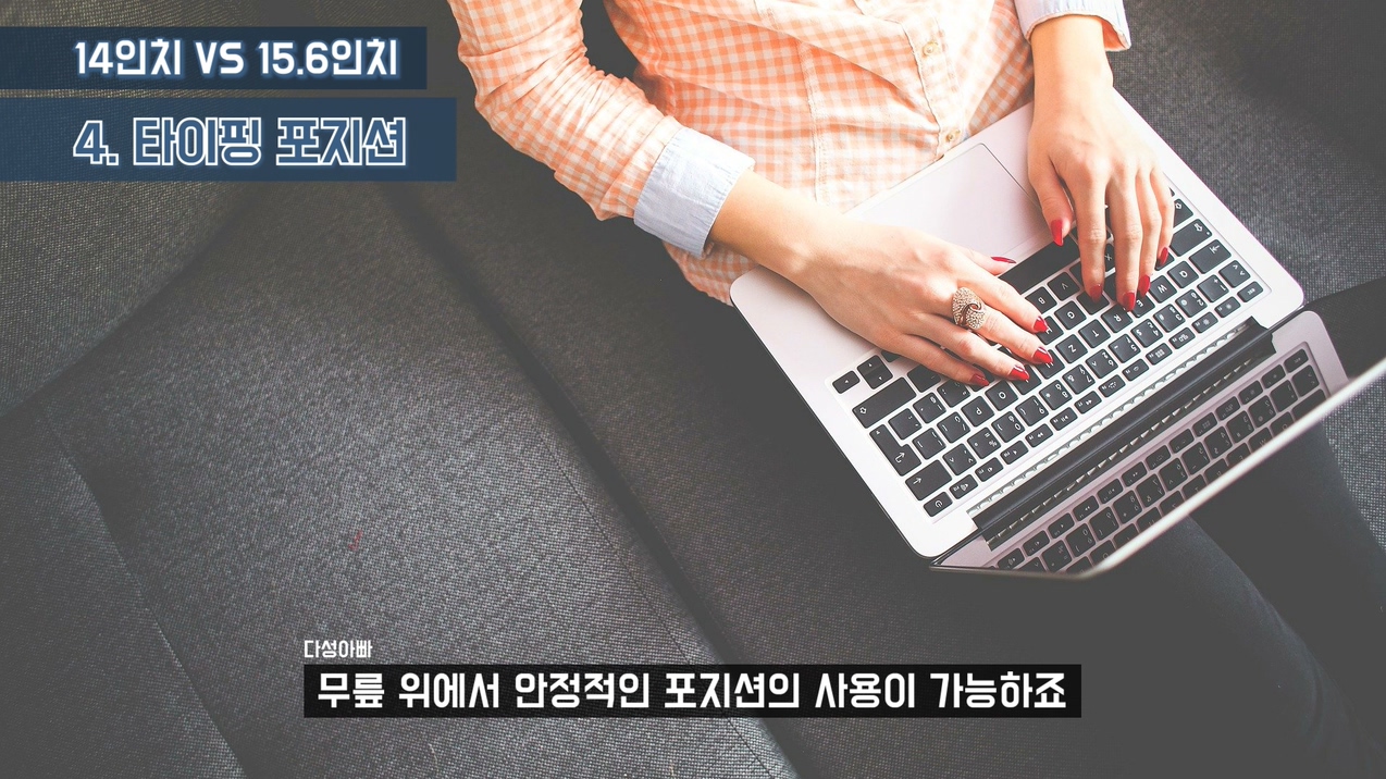 이렇듯 타이핑 포지션은 굉장히 중요하고, 일반적인 마우스 사용을 많이 하는 사용자들 보다 타이핑을 많이 사용하는 사용자들에게는 작업효율을 올려주는 가장 중요한 부분이라고 생각합니다. 그런 의미로 저는 문서 작업용 노트북은 14인치를 추천합니다. 같은 의미로 삼성에서 나오는 15.6인치가 아닌, 15인치 사이즈의 노트북도 있는데 비싸긴 하지만 문서작업용으로 좋은 노트북이라 생각합니다. 맥북도 굉장히 좋지만 윈도우 기반 노트북이 아니다 보니 제외하도록 하겠습니다.