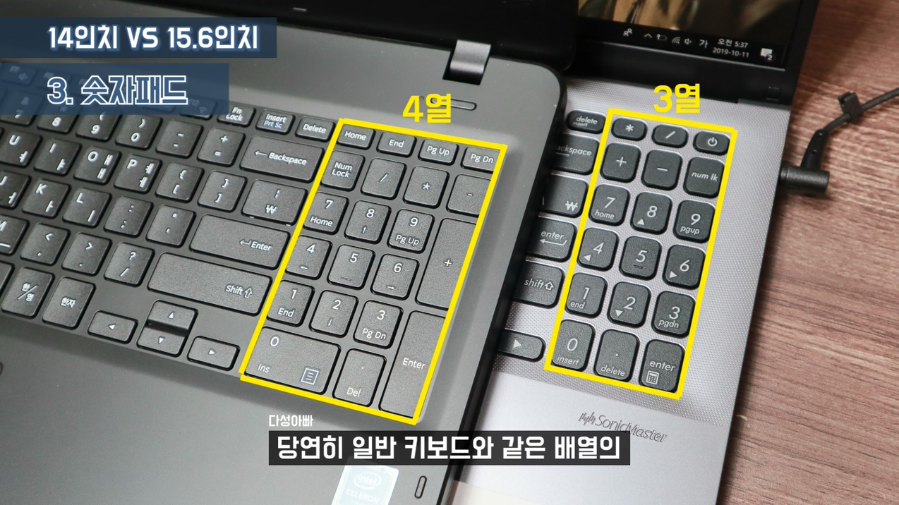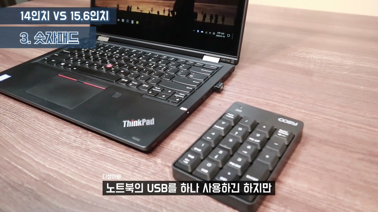 15.6인치는 키보드에 숫자패드가 달려있다는 굉장히 큰 장점이 있습니다. 14인치는 숫자패드가 없어요. 그래서 숫자패드를 효율적으로 사용하기 위해서는 15.6인치가 좋습니다. 15.6인치의 숫자패드도 3열과 4열 두 종류가 있는데 당연히 일반 키보드와 같은 배열의 4열이 편합니다. 하지만 4열이 꼭 좋은 건 아닙니다. 4열이 들어갔다는 건 그만큼 노트북의 가로 사이즈가 길다는 의미이고, 가로 사이즈가 길다는 의미는 배젤이 넓다는 의미입니다. 한마디로 노트북이 큰 거죠. 사이즈가 경량화 된 15.6인치 노트북들은 제로베젤 디자인으로 인해 어쩔 수 없이 3열 숫자패드를 사용하니 4열이 꼭 좋은 것 만은 아닙니다. 그리고 14인치를 꼭 사용하고 싶은데 숫자패드 사용량이 많다면 이렇게 숫자패드 키보드를 따로 사용하세요. 무선 제품도 만원 정도면 구매 가능하니 숫자패드 사용량이 많은 분들에게는 좋은 선택이 될 수 있습니다. 이 제품 구매할 때 주의 하실 점은 블루투스 제품 사지 마세요. 대기 시간으로 인해 키가 씹히는 경우가 있는데 실사용시 그 부분이 꽤 불편합니다. 일반 블루투스 키보드는 사용량이 많기 때문에 막상 사용하면 대기에 걸릴 일이 없는데 숫자패드는 가끔 사용하기 때문에 대기에 걸릴 때 마다 피곤합니다. 이렇게 리시브가 있는 방식을 2.4Hz 무선방식이라고 부르는데 이런 방식이 노트북의 USB를 하나 사용하긴 하지만 대기 시간 없이 언제나 빠르게 입력 가능합니다.