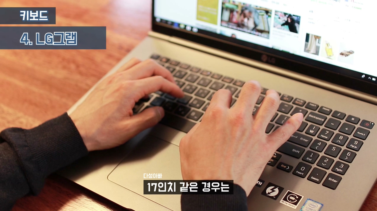 마지막으로 가격은 비싸지만 그램의 키감도 굉장히 좋습니다. 그램 15인치는 마그네슘합금 바디로 인해 바디를 튼튼하게 잘 잡아주는 것에 비해 17인치 같은 경우 더 두껍게 마그네슘 합금소재를 사용했음에도 불구하고 본체 면적이 넓기 때문에 타이핑시 울렁거림이 조금 발생하는 것이 아쉬웠습니다.