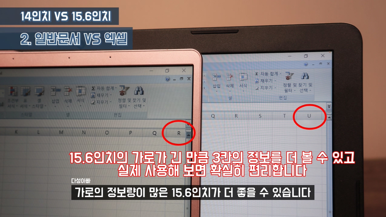 글 쓰기는 기본적으로 위에서부터 아래로 써 내려갑니다. 디스플레이를 세로로 사용한다는 의미죠. 그리고 윈도우10 기준 자동 글씨 크기 조절이 가능하기 때문에 14인치를 사용하나 15.6인치를 사용하나 가독성의 차이는 거의 없다고 보시면 됩니다. 사용성에 차이가 없다는 거죠. 그렇기 때문에 아래로 써 내려가는 문서작업을 기준으로 봤을 때는 15.6인치의 장점은 딱히 없습니다. 오히려 사이즈가 커서 휴대성이 떨어진다는 단점만 있죠. 하지만 가로 사용을 해야 하는 글쓰기가 있습니다. 엑셀이죠. 엑셀을 많이 사용한다면 가로의 정보량이 많은 15.6인치가 더 좋을 수 있습니다.