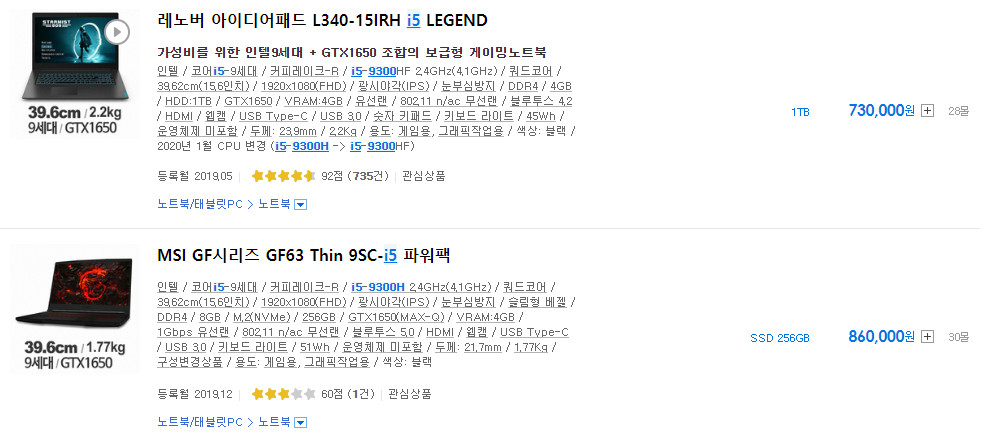 예산을 100만원 초반으로 잡았다면, i7-9750H의 고성능 노트북을 추천합니다. 발열 처리는 아쉬울 수 있지만 성능 만큼은 데스크탑급으로 나옵니다. 성능에 대한 스트레스는 없으며, 장시간 사용시 쿨러 사용은 필수입니다.