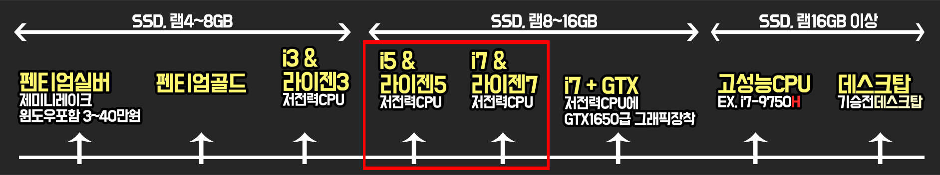 차선책으로 노트북을 고를 때 노트북 스펙을 잘 모르시는 분들은 보통 이 구간에서 고르시고, 노트북 스펙을 볼 줄 알고