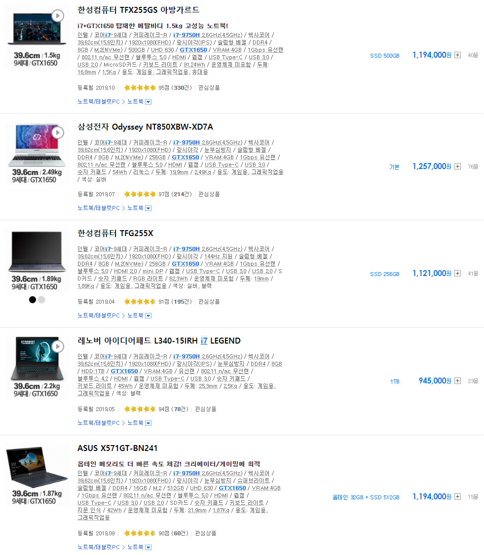 i7-9750H에 램16~32GB, GTX1650이면 웬만한 작업 모두 원활하게 가능합니다. 고성능 노트북의 보급형 제품으로 보시면 100만원 초반으로도 충분히 좋은 노트북 구매 가능합니다. 이 구간의 비싼 노트북들이 비싼 이유는 경량화를 하기 위해 많은 투자비용이 들어갔고 경량을 위한 부품이 들어갔기 때문이죠. 쉽게 말해 이 구간의 노트북들은 무게와 부피가 성능입니다. 반면 고성능 노트북은 경량화에 크기 신경 쓰지 않기 때문에 전체적으로 기본에 충실한 모습을 보이죠.