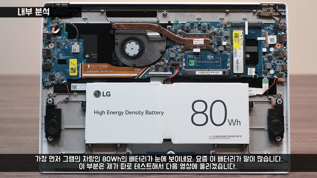 가장 먼저 그램의 자랑인 80Wh의 배터리가 눈에 보이네요. 요즘 이 배터리가 말이 많습니다. 이 부분은 제가 따로 테스트해서 다음 영상에 올리겠습니다. 그리고 허접해 보이는 스피커가 양쪽에 있습니다.