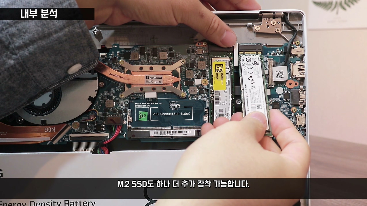 그리고 중요한 것이 무게 밸런스 입니다. 다른 노트북과 그램을 비교했을 때 어색한 부분이 보통의 노트북은 배터리가 이쯤에 있는 것이 비해 상대적으로 올라와 배치 되어있고, 팬과 히트싱크는 노트북 끝에 달려있으면 좋은데 이건 상대적으로 내려와있죠. 그램의 전체적인 무게 밸런스를 맞추기 위해 이러한 구조가 된 겁니다.