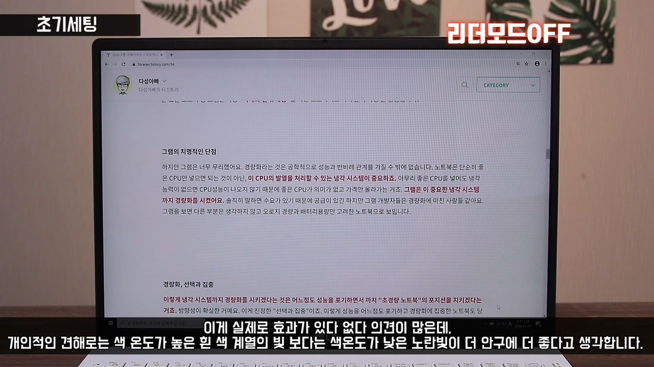 리더모드는 스마트폰에 있는 블루라이트 차단 기능과 동일하게 디스플레이의 청색광, 쉽게 말해서 이렇게 흰 바탕을 노란빛으로 바꿔 시력을 보호해 준다고 주장하는 기능입니다. 이게 실제로 효과가 있다 없다 의견이 많은데, 개인적인 견해로는 색 온도가 높은 흰 색 계열의 빛 보다는 색온도가 낮은 노란빛이 더 안구에 더 좋다고 생각합니다. 그래서 저는 글 읽을 때 자주 사용합니다.