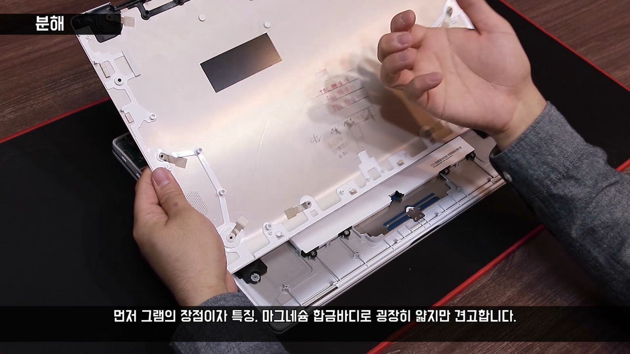 가장 먼저 그램은 밀스펙을 통과한 내구성 좋은 노트북입니다. 이렇게 허접해 보이는 내부가 어떻게 밀스펙을 통과했는지가 중요하고, 그것이 경량화의 과학입니다.