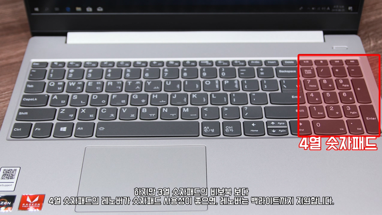 두 제품 모두 키감이 좋은 키보드는 아닙니다. 하지만 비보북 같은 경우 에르고리프트 힌지 지원으로 좀 더 편안한 타이핑 포지션을 가져갈 수 있습니다. 그래서 장기적으로 사용할 때 확실히 비보북이 장점이 있습니다. 하지만 3열 숫자패드의 비보북 보다 4열의 숫자패드의 레노버가 숫자패드 사용성이 좋으면, 레노버는 백라이트까지 지원합니다. 사실 이 가격 대 보급형 노트북에 백라이트 들어가는 제품이 거의 없기 때문에 전체적인 키보드는 레노버가 좀 더 낫다고 생각합니다.